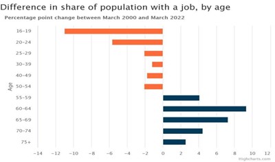 - Demographics in the U.S. suggest an aging population with the working population shrinking relative to the dependent population. With relatively fewer workers providing goods and services to a growing population, labor markets will become tighter. Unless productivity increases at the same rate as employment falls, costs must rise; for a given level of demand, prices will rise to compensate. The fall in the labor force participation rate, especially among those under 55, reinforces the demographic implications just noted. See below chart and the related article in the Conversable Economist. Furthermore, unit labor costs – the ratio of labor cost per hour to output per labor hour – have risen and are likely to continue to rise with subsequent rises in prices. For 2021 and 2022, the Bureau of Labor Statistics reported that unit labor costs in the business sector rose by 8.3% and 8.4%, respectively.